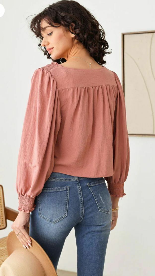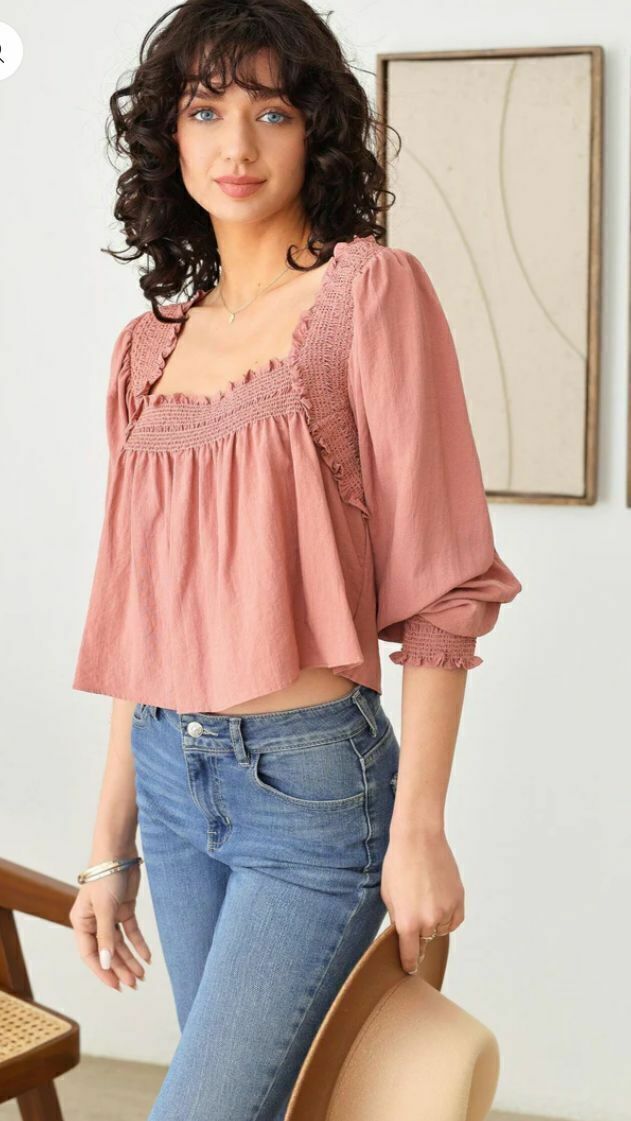 Una blusa cropped de estilo bohemio con escote cuadrado y detalle de jaretas smock en el canesú, cuerpo suelto con suaves frunces que aportan volumen ligero y mangas globo con puño smock para un toque romántico. Su tejido vaporoso combina fluidez y textura artesanal, deslizándose con suavidad sobre la piel y manteniendo frescura en cada movimiento. El tono rosa terracota realza cualquier look primaveral, fusionando comodidad y sofisticación sin esfuerzo.